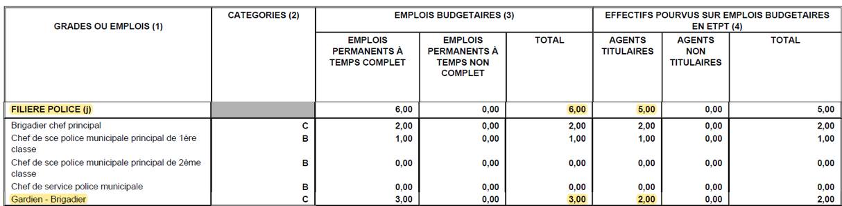Le tableau des emplois budgétaires de la ville prévoit 6 postes à temps plein pour la police municipale.